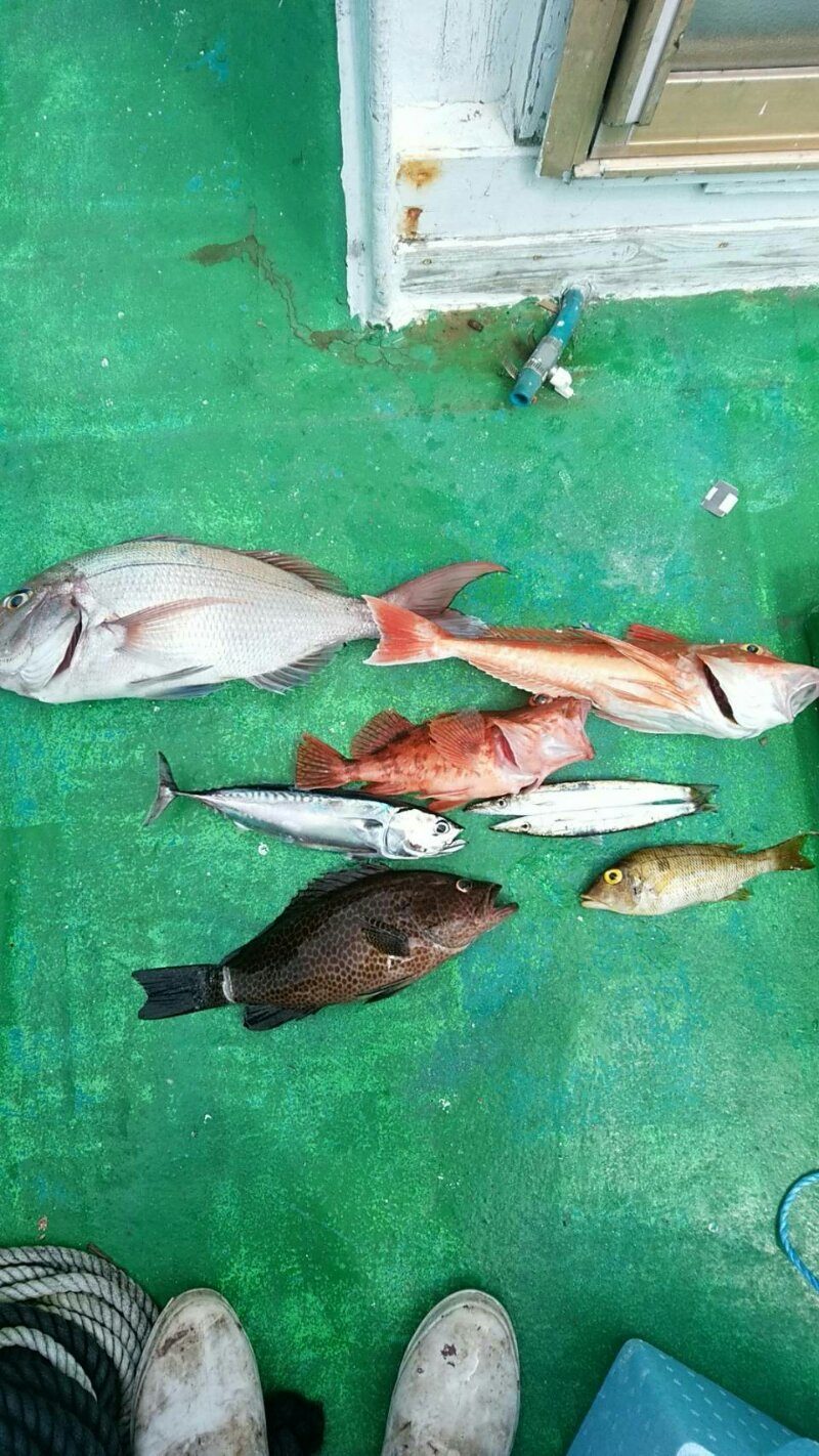 一人のお客様で鯛ラバで出船。真鯛50cm、ホウボウ、アズキマス、カサゴ等釣り上げられました。暑い中頑張ってくださいましてありがとうございました。 今日の釣果です。 -