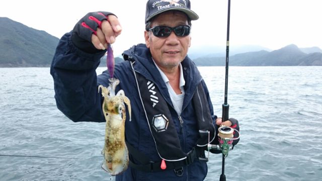 京都市の岩井さんらの乗り合いで出船。今日は朝一番から爆風で途中からは無風で難しい状態で食いが渋くアオリイカ12杯に終わりました。厳しい状態の中最後まで頑張ってくださいましてありがとうございました。 -