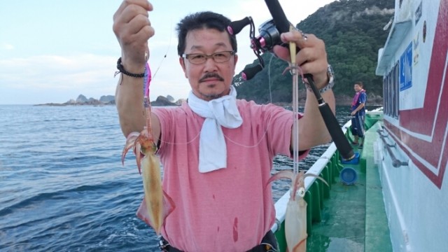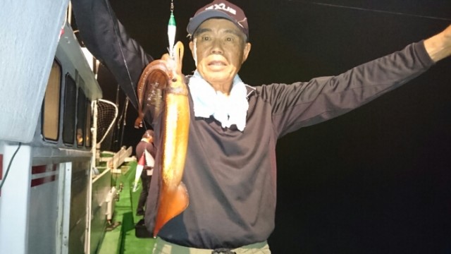 四日市市の野田さんら出船。潮が速く厳しい状態で食いが渋かったですが頑張ってくださりお土産は釣り上げていただきましたありがとうございました。 野田さんはスルメイカ連発でした。 萩さんはアカイカ連続で釣り上げられました。 -