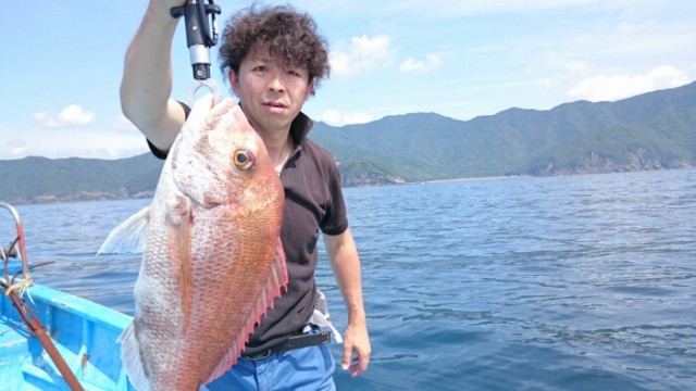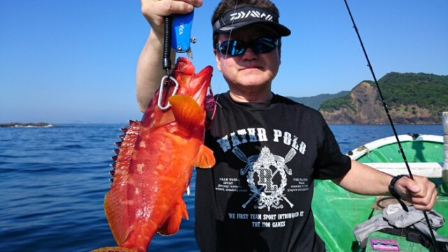 北名古屋市のスギちゃんら二人でテンヤで出船。真鯛は30cmを1尾でしたがメバル、カワハギ、アカハタ等釣り上げられました。全て大型で一時は連発で後半潮が速くなるまでは順調でした。暑い中ありがとうございました。 スギちゃん特大アカハタを釣り上げら... -