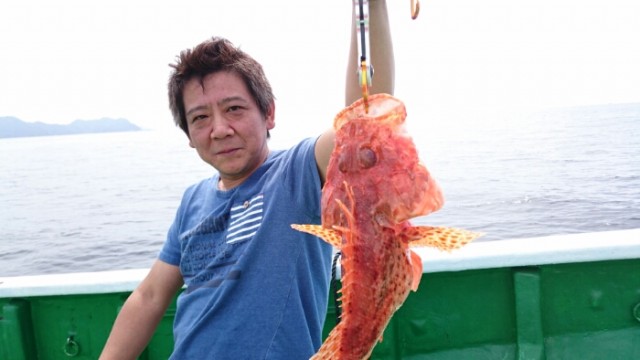 名古屋市の岩崎さんら二人で鯛ラバで出船。真鯛は残念ながら釣れませんでしたがアオハタ、オニカサゴ、カサゴ等釣り上げられました。最後まで頑張ってくださいましてありがとうございました。 岩崎さん特大オニカサゴを釣り上げられました。 -
