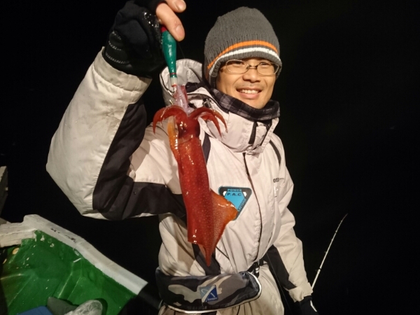 名古屋市の小川さんら二人でアオリイカ3杯、もう一度の乗り合いでは1杯釣り上げられました。時折突風が吹き厳しい状態でしたが最後まで頑張ってくださいましてありがとうございました。 須山さん食いが渋い中頑張ってくださいました。 -