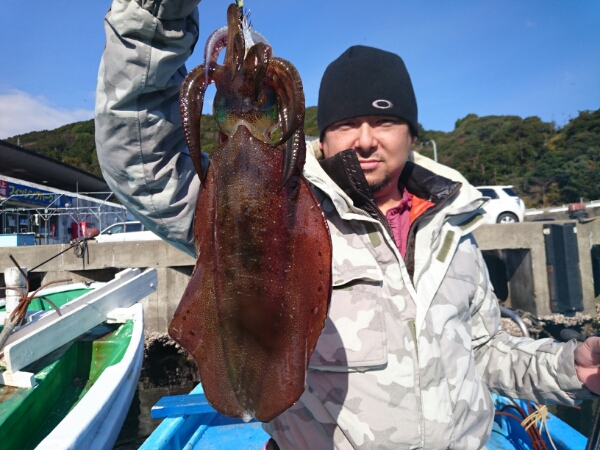 鈴鹿市の古林さんら三人でアオリイカ25cm、24cmを2杯釣り上げられました。もう一隻の乗り合いは釣果はありませんでした。波が高く風も強い厳しい状態でしたが皆様頑張ってくださいました。ありがとうございました。 古林さん厳しい状態の中良型を釣り上げ... -