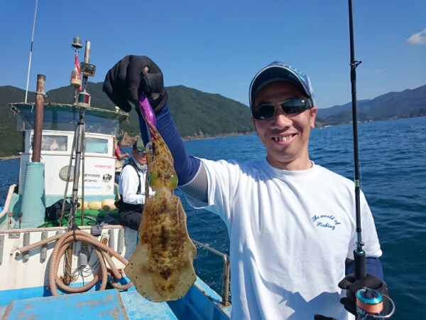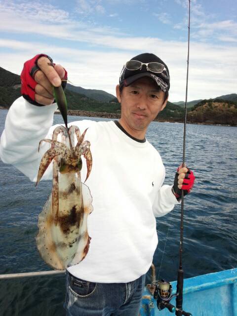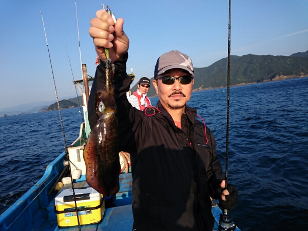 京都市の江谷さんらの乗り合いで出船しましたが食いが渋く残念ながらアオリイカ2杯に終わりました。最後まで頑張ってくださいましてありがとうございました。 江谷さん朝いきなり良型ゲットしました。 -