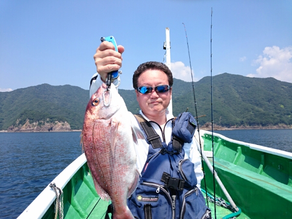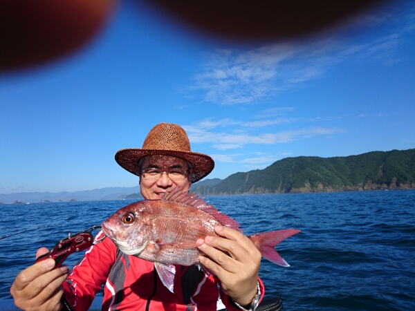 北名古屋市の杉ちゃんが一人でテンヤで出船。真鯛50cm~38cmを4尾他カサゴ、アカハタ等釣り上げられました。暑い中頑張って下さいましたありがとうございました。 杉ちゃん朝一番から連発で釣り上げられました。 -