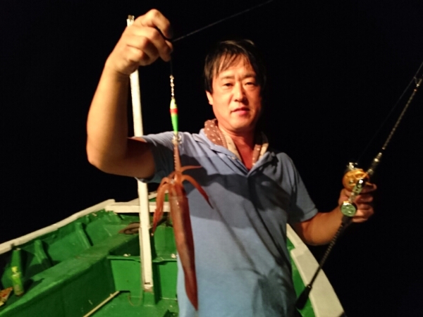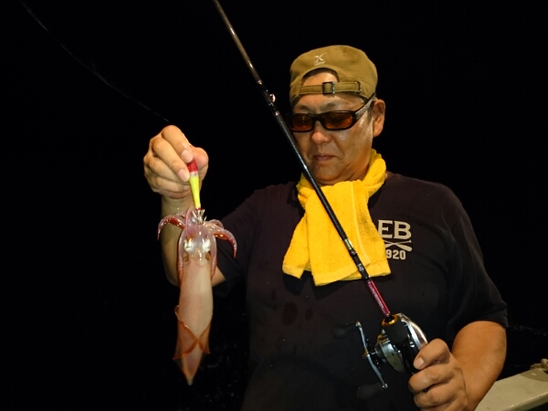 松阪市の奥田さんら三人で出船。月夜の為明るく厳しい状態でしたが前半こそ苦戦しましたが後半はアカイカも型は良く順調に釣れて良かったです。 奥田さん最初はスルメイカでした。 神薗さん初めてでしたが良型アカイカゲットしました。 -