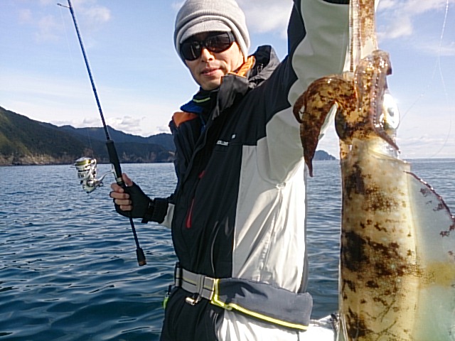亀山市の伴さんお一人で出船しましたが風が強く大変厳しい状態でした。風裏を選んで行きましたが突風が吹きあれなんとか小さかっですがアオリイカ 2杯釣り上げられました。最後まで頑張ってくださいましたありがとうございました。 -