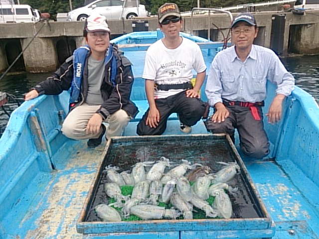 松阪市の池田さんら二人で出船。高い波と強風で大変厳しい状態でしたがアオリイカ10杯釣り上げられました。船酔いしながらも頑張ってくださいましたありがとうございました。強い雨と波で写真を撮る事が出来ませんでした。 -