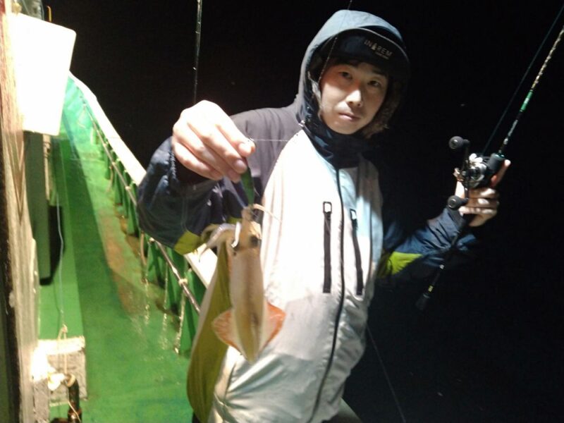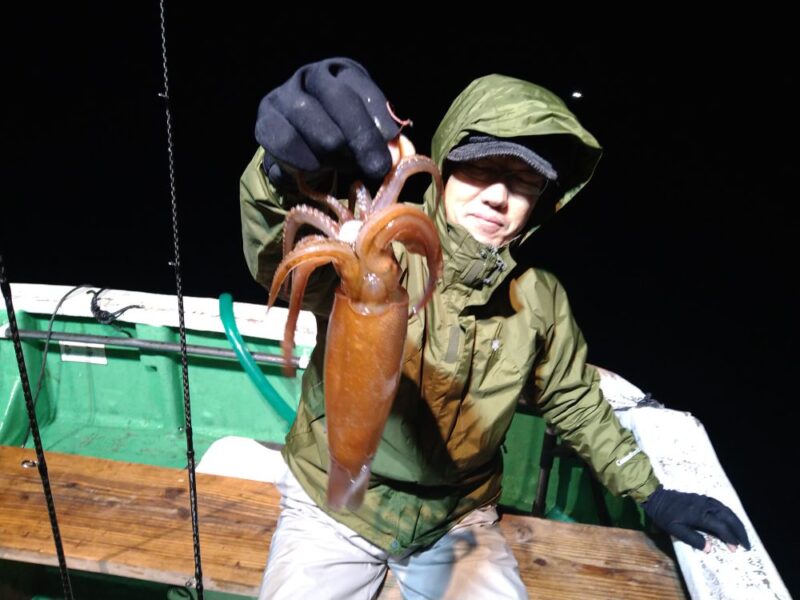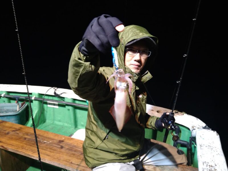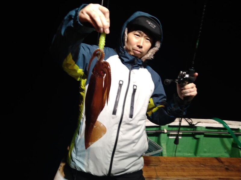 バチコンから始めて雨と風の中頑張って下さいましたが食いが渋くイカメタルに切り替えるとアカイカがポツリポツリで後半になってスルメイカが釣れ出してまずまず順調で一人で二桁釣り上げて下さいました。お客様には前半雨風で後半はうねりが高い中頑張って下さいましてありがとうございました。