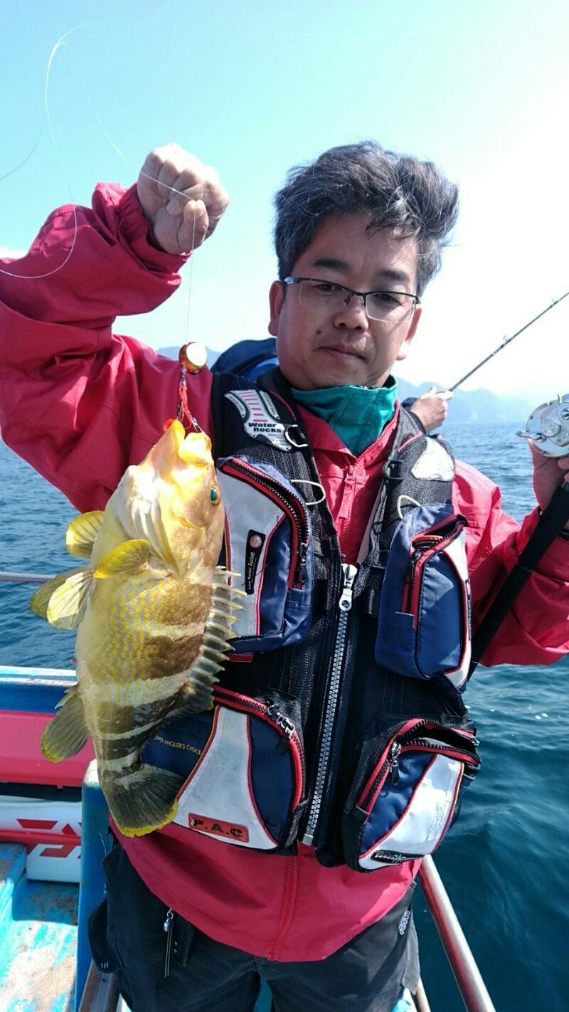 津市の山城さんら5人で鯛ラバで出船。食いが渋く真鯛1尾、アオハタ1尾に終わりました。食いが渋い中最後まで頑張ってくださいましてありがとうございました。 山城さんはいい型のアオハタを釣り上げられました。