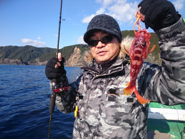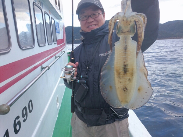 鈴鹿市の古林さんら三人でアオリイカ25cm、24cmを2杯釣り上げられました。もう一隻の乗り合いは釣果はありませんでした。波が高く風も強い厳しい状態でしたが皆様頑張ってくださいました。ありがとうございました。 古林さん厳しい状態の中良型を釣り上げ... -
