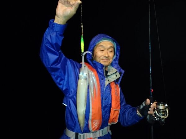 豊田市の宇野さんら四人の乗り合いで出船しましたが食いが渋く一人数杯程に終わりました。強い雨の中最後まで頑張ってくださいましたありがとうございました。 安藤さんアカイカに続きスルメイカを釣り上げられました。 -